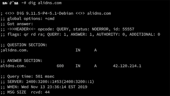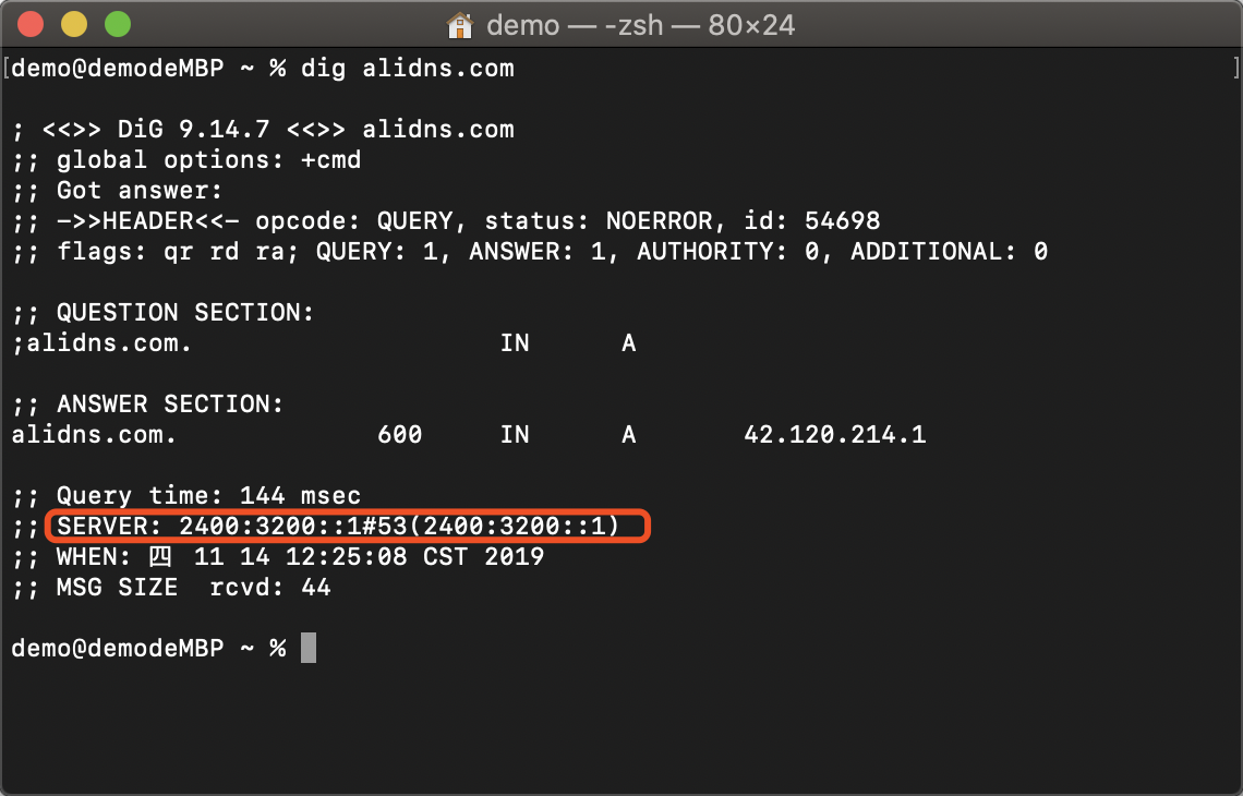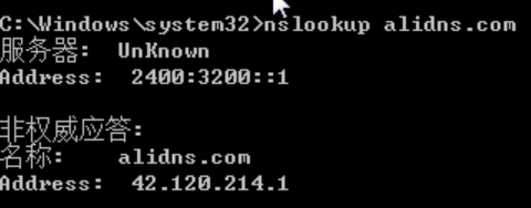 dig alidns.com 若返回结果的server为阿里公共DNS(2400:3200::1或2400:3200:baba::1)则配置成功。